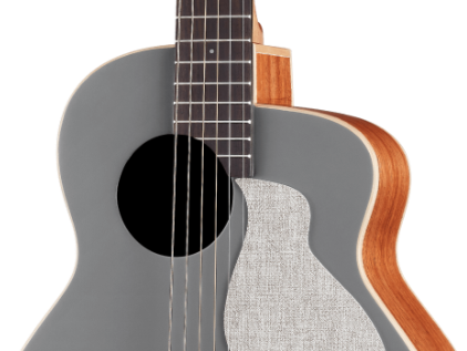 面板搭配 Pantone 寧靜灰調和的開放啞光漆,取自影子因光的強弱產生的變化,沈穩而內斂,在生活中有調節視覺感知的顏色,充滿知性、與想像的精神意義。左上偏移的「補償音孔設計」,增加共鳴震動的空間外,也平衡高、中、低音的清晰度。音孔旁的耐抓布料,挑選家飾布材質,經歷反覆測試,完美黏合耐得住,盡情彈奏也不怕。楓木鑲嵌琴身外側,美觀及保護功能兼具。