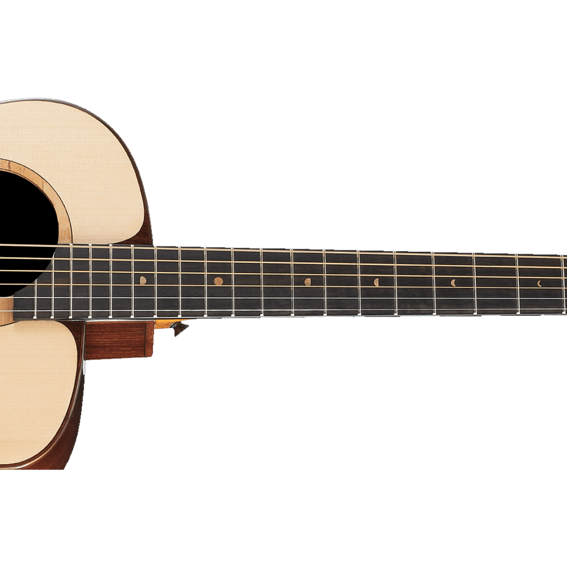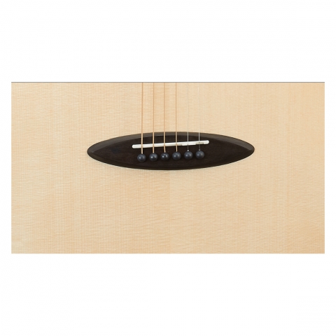 鳥吉他定製的橢圓造型琴橋,使用烏黑色澤的黑檀木,擁有緊密的木紋硬度,硬度更勝玫瑰木,能支撐琴的後段琴弦張力。搭配水牛骨弦枕,讓琴的延音有力,且擁有純淨的音色,質地堅硬清脆,能有效的傳導琴弦的共鳴。每一根弦都做了個別補償,讓琴能有更精准的音准。