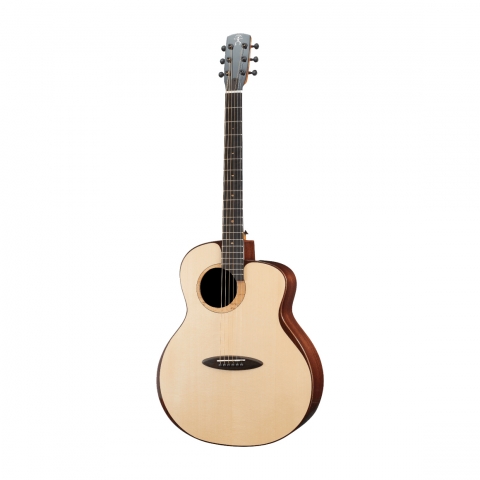 使用月亮雲杉木面板,搭配印度玫瑰木背、側板。月亮雲杉木,木材較一般雲杉白皙,除了雲杉的直條木紋之外,還擁有緊密的橫紋。