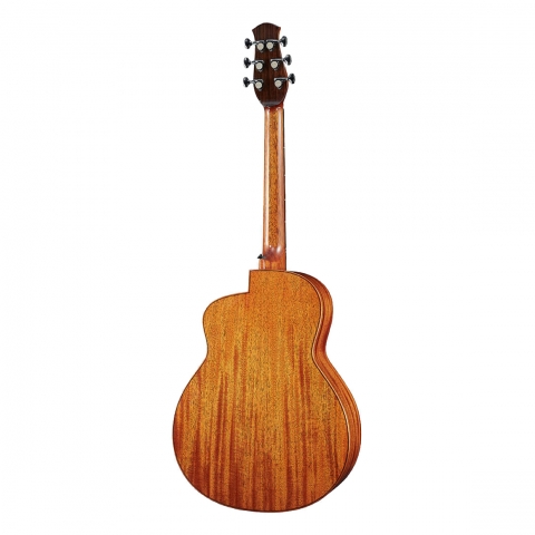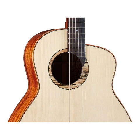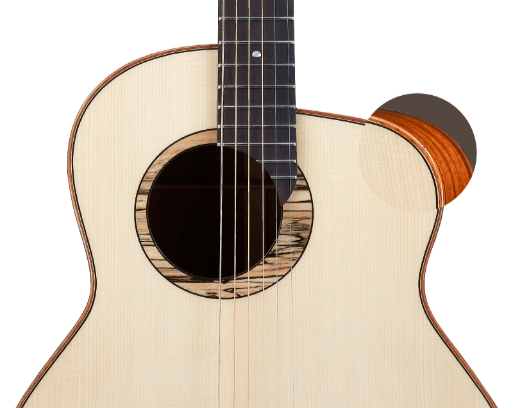 弦鈕的位置經精密規劃,讓琴弦可呈現近乎垂直的狀態。特別設計的「倒梯形」油浸牛骨,能均衡琴弦的張力,並延續琴弦近乎垂直的狀態,讓琴弦所受的干擾更少,音色的傳遞上能更純粹。使用日本品牌 Gotoh 510,1:21齒輪式弦鈕,咬合準確、轉動順暢,能有效的校正音準。音孔花圈鑲嵌腐朽楓木,增添層次與細節。玫瑰木鑲嵌琴身外側,美觀及保護功能兼具。細節介紹
