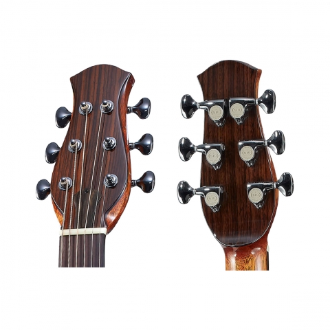 玫瑰木琴頭貼片,以杉田健司設計的3D立體雕刻做琴頭造型,並在琴頭背後補強增加穩定度。琴身材質