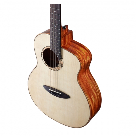 使用月亮雲杉木面板,搭配非洲桃花心木背、側板。月亮雲杉木,木材較一般雲杉白皙,除了雲杉的直條木紋之外,還擁有緊密的橫紋。月亮雲杉木不易吸濕與放濕,是相當穩定的木材。木質輕盈,音色明亮清脆、甜美細緻,有著圓潤又優雅的聲音特質,在音色的平衡上有相當不錯的表現。適合各種彈唱、演奏。因每年有限定砍伐,因此數量較少。非洲桃花心木,顏色大多為紅褐色淺咖啡色帶細紋,與一般桃花心木相比,較容易乾燥,穩定性也相對優異。紋路較直、質地堅硬重量輕,聲音傳導較快,彈奏時豐滿的中頻加上高頻較有顆粒感,低頻的呈現較溫暖豐富。面板、側背板的木材,都是經過數年的自然乾燥所製成。全單板的木材,讓琴的震動和諧,充分發揮木材自然特性的音色,擁有渾厚完整的共鳴,經過一段時期的「開聲」彈奏後,木材對聲音更加敏感,音色可再提升。杉田健司為吉他未來系列「一體共振」空氣的波動,撥弦後釋放出來的波動,首先面板達到共振,可以和周邊琴身,琴柄,琴頭一層一層達到共振,而帶動出美妙的音色。光透面板厚度控制在2.5mm,力木設計要能夠穩定面板,防止變型和支撐弦的張力。 經過三年來反覆的調校,做出清晰有彈性的音色,消除木頭硬硬的音色。衡樑力木