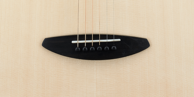 鳥吉他定製的造型琴橋,使用烏黑色澤的黑檀木,擁有緊密的木紋硬度,硬度更勝玫瑰木,能支撐琴的後段琴弦張力。搭配古式工法油浸牛骨弦枕,將牛骨浸於油質液體中製成。再經製琴師精心手工打磨後拋光,呈現油亮質感。讓琴的延音有力,且擁有純淨的音色,質地堅硬清脆,能有效的傳導琴弦的共鳴。每一根弦都做了個別補償,讓琴能有更精准的音准。
