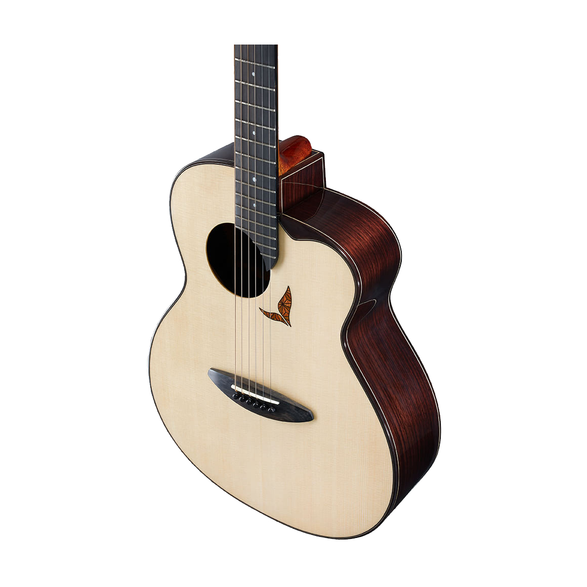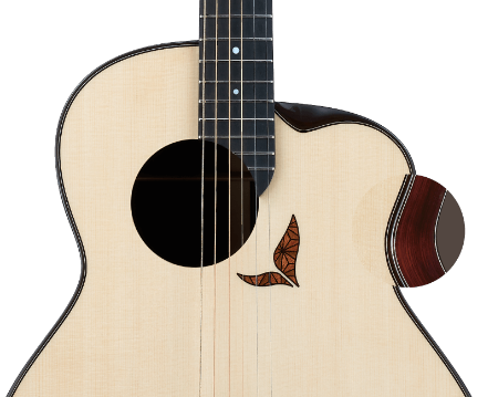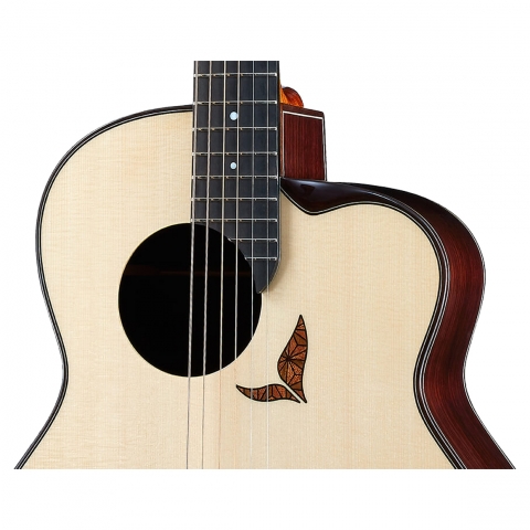 杉田健司設計桶身切角倒角設計,讓高把位更好上手。箱根寄木細工拼花飛鳥設計在飛翔在音孔旁,與補償音孔設計相對稱,增添層次與細節。玫瑰木鑲嵌琴身外側,美觀及保護功能兼具。結構設計