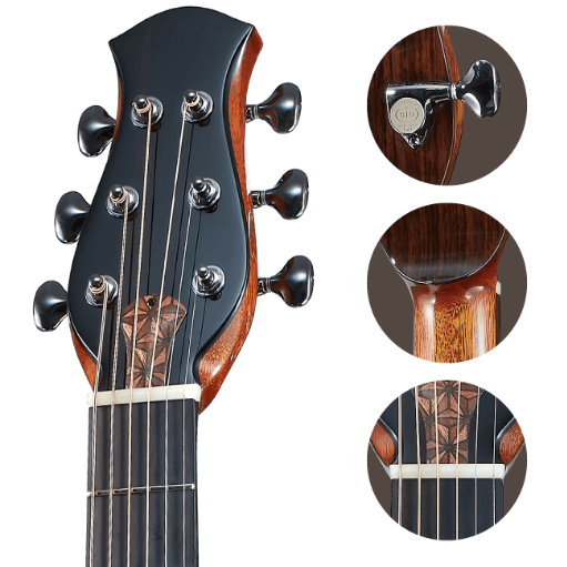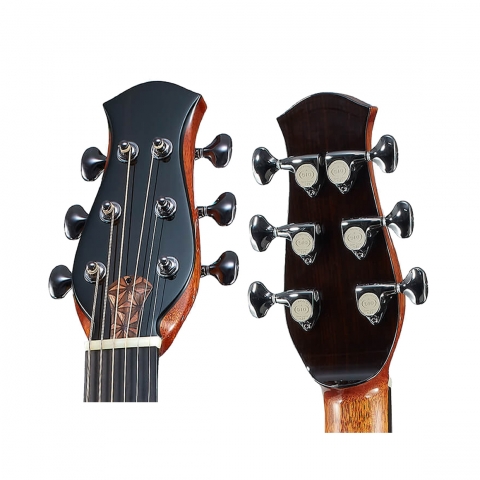 黑檀木琴頭貼片,以杉田健司設計的3D立體雕刻做琴頭造型,並在琴頭背後補強增加穩定度。弦鈕的位置經精密規劃,讓琴弦可呈現近乎垂直的狀態。特別設計的「倒梯形」油浸牛骨,能均衡琴弦的張力,並延續琴弦近乎垂直的狀態,讓琴弦所受的干擾更少,音色的傳遞上能更純粹。 使用日本品牌 Gotoh 510,1:21齒輪式弦鈕,咬合準確、轉動順暢,能有效的校正音準。指板材質