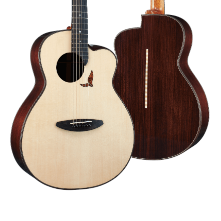 使用月亮雲杉木面板,搭配印度玫瑰木背、側板。月亮雲杉木,木材較一般雲杉白皙,除了雲杉的直條木紋之外,還擁有緊密的橫紋。月亮雲杉木不易吸濕與放濕,是相當穩定的木材。木質輕盈,音色明亮清脆、甜美細緻,有著圓潤又優雅的聲音特質,在音色的平衡上有相當不錯的表現。適合各種彈唱、演奏。因每年有限定砍伐,因此數量較少。印度玫瑰木,擁有筆直的木紋,顏色呈現暗紅至深咖啡色。木頭質地硬,含有豐富的油脂不易變形,傳導速度快、音色溫和,中高音飽滿有力,低頻沈穩,掌握度很高,無論是獨奏或是伴奏都非常適合。面板、側背板的木材,都是經過數年的自然乾燥所製成。全單板的木材,讓琴的震動和諧,充分發揮木材自然特性的音色,擁有渾厚完整的共鳴,經過一段時期的「開聲」彈奏後,木材對聲音更加敏感,音色可再提升。杉田健司為吉他未來系列「一體共振」空氣的波動,撥弦後釋放出來的波動,首先面板達到共振,可以和周邊琴身,琴柄,琴頭一層一層達到共振,而帶動出美妙的音色。光透面板厚度控制在2.5mm,力木設計要能夠穩定面板,防止變型和支撐弦的張力。 經過三年來反覆的調校,做出清晰有彈性的音色,消除木頭硬硬的音色。衡樑力木