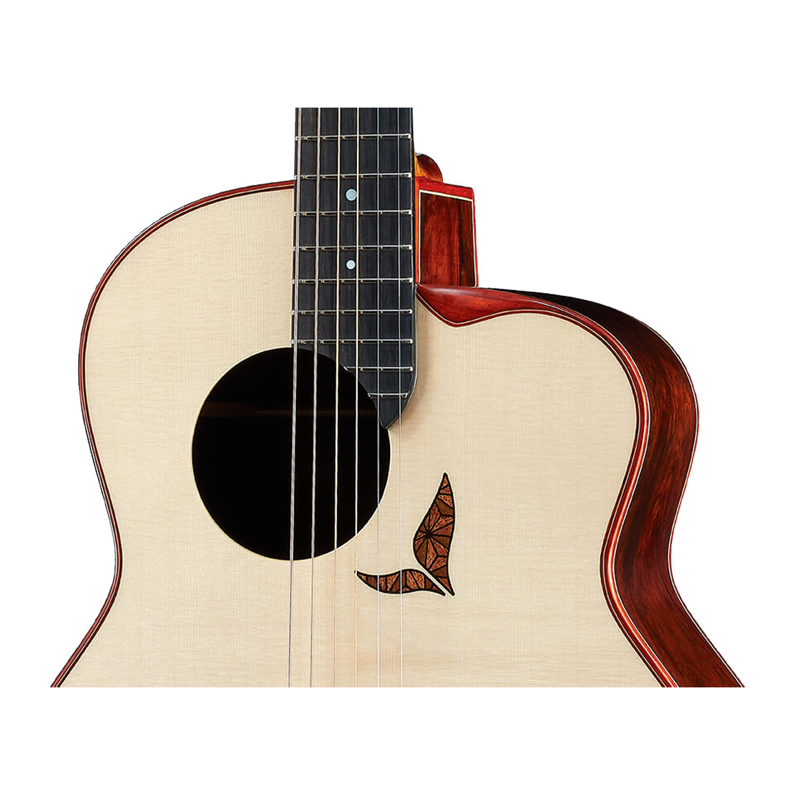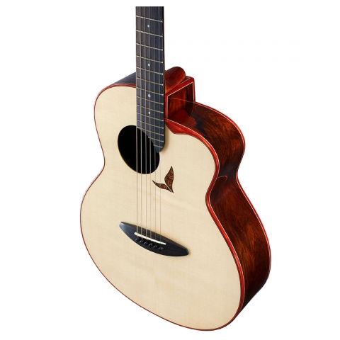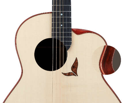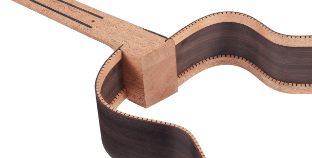 採用西班牙接柄(Spanish Neck),是古典吉他常用的接柄工法。一體式的嵌入,將側板插入凹槽、再將背板與面板連接起來,可以確保結構的穩定性,堅固不易變形。並能充分傳導聲音的震動,增加共鳴與音色。