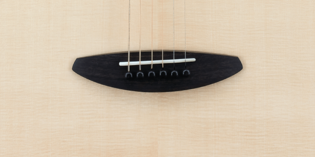 鳥吉他定製的造型琴橋,使用烏黑色澤的黑檀木,擁有緊密的木紋硬度,硬度更勝玫瑰木,能支撐琴的後段琴弦張力。搭配古式工法油浸牛骨弦枕,將牛骨浸於油質液體中製成。再經製琴師精心手工打磨後拋光,呈現油亮質感。讓琴的延音有力,且擁有純淨的音色,質地堅硬清脆,能有效的傳導琴弦的共鳴。每一根弦都做了個別補償,讓琴能有更精准的音准。