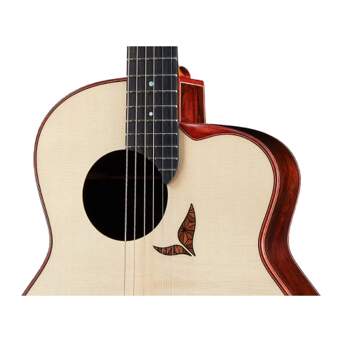 手工打磨水滴狀琴桁,演奏時手感更滑順。琴頸與指板經過拋光、打磨、倒角、去毛刺等多種細節程序處理,講究指板弧度打磨設計,能符合手指弧度,讓持琴手感更加舒適。桃花心木琴頸內部加了兩條黑檀木條,讓琴頸更穩定的震動。指板使用烏黑色澤的黑檀木,擁有緊密的木紋,硬度更勝玫瑰木。黑檀木的傳導特性,將吉他的高頻更加地顯現出來。上弦枕寬度為44mm,指板點鑲嵌白貝殼,並在3, 5, 7, 9, 12, 15格做出大小圓點,更添質感與細節,擁有21格琴格讓彈奏音域更廣。