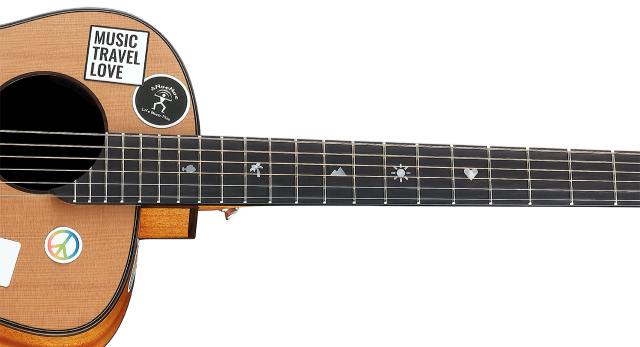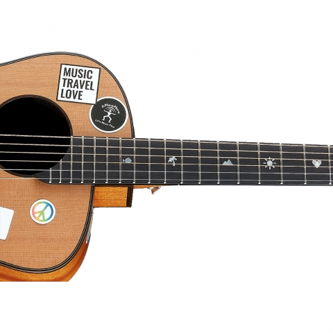 指板使用烏黑色澤的黑檀木,擁有緊密的木紋,硬度更勝玫瑰木。黑檀木的傳導特性,將高頻更加地顯現出來。琴頸與指板經過拋光、打磨、倒角、去毛刺等多種細節程序處理,講究指板弧度打磨設計,能符合手指弧度,44mm的琴頸寬讓持琴手感更加舒適。指板點設計,將Music Travel Love的核心精神化作喜愛的元素以「愛心、太陽、山、椰子樹、魚」等造型搭配貝殼材質鑲嵌。21格琴格讓彈奏音域更廣。