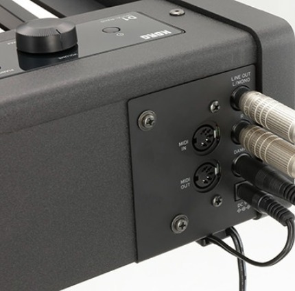IN/OUT 連接器D1 提供您在舞台上需要的外部連接插孔。標準尺寸的 LINE OUT 插孔可以直接連接到放大揚聲器或錄音設備。還提供 MIDI 輸入/輸出連接器。您可以通過 MIDI 接口將它們連接到您的計算機,並將 D1 用作 MIDI 鍵盤或鋼琴音源。