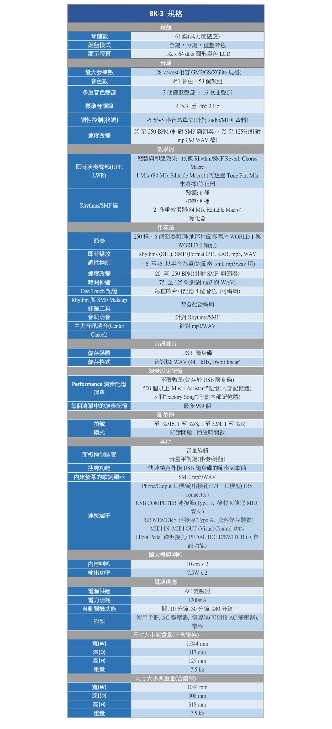 BK-3裝載了涵蓋世界各地包括東歐、拉丁美洲與亞洲音樂風格的大量音樂與節奏。內建超過850種音色與50種鼓組,為旋律演奏與伴奏提供包羅萬象的聲音。相容於GM2,GS,與XG Lite音源規格,確保使用標準MIDI音樂檔時能得到高品質的播放表現。