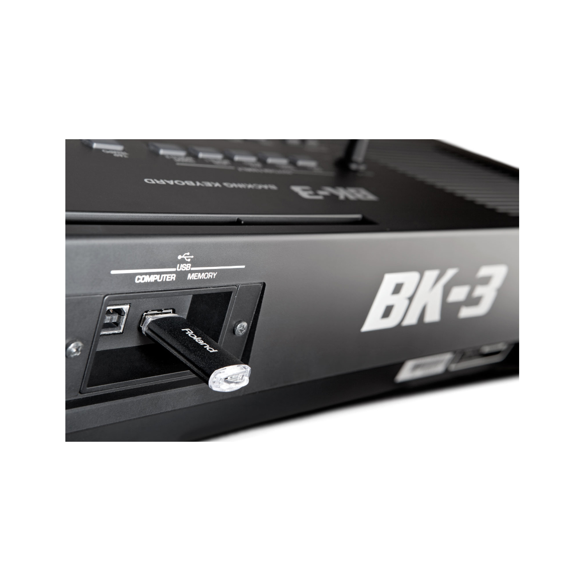 BK-3可以用選購的USB隨身碟,播放多種音樂格式,包括WAV與MP3音訊檔、SMF音樂檔,以及Roland節奏檔(BK, E, G與VA系列)。播放的速度與歌曲的曲調,皆可因應您的演唱音域或演奏需求輕鬆地調整,甚至音訊檔也能夠做調節。此外,您可以利用Center Cancel中央音頻消音功能,將市售WAV/MP3歌曲的主旋律人聲音量做削減,用來作為卡拉OK伴唱使用以及演奏搭配等應用。