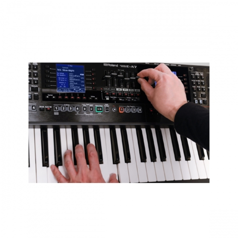 由於E-A7配備大量的按鍵與推桿,所有演出必備的功能盡在您的指掌之下。您也可以將多項設定,儲存成一組使用者設定,例如聲部、自動過門與輸入效果器的開/關狀態等等。讓您輕鬆地製作演出曲目的鍵盤設定。您也可以從USB隨身碟直接使用Roland 的BK伴奏鍵盤系列上的使用者設定。