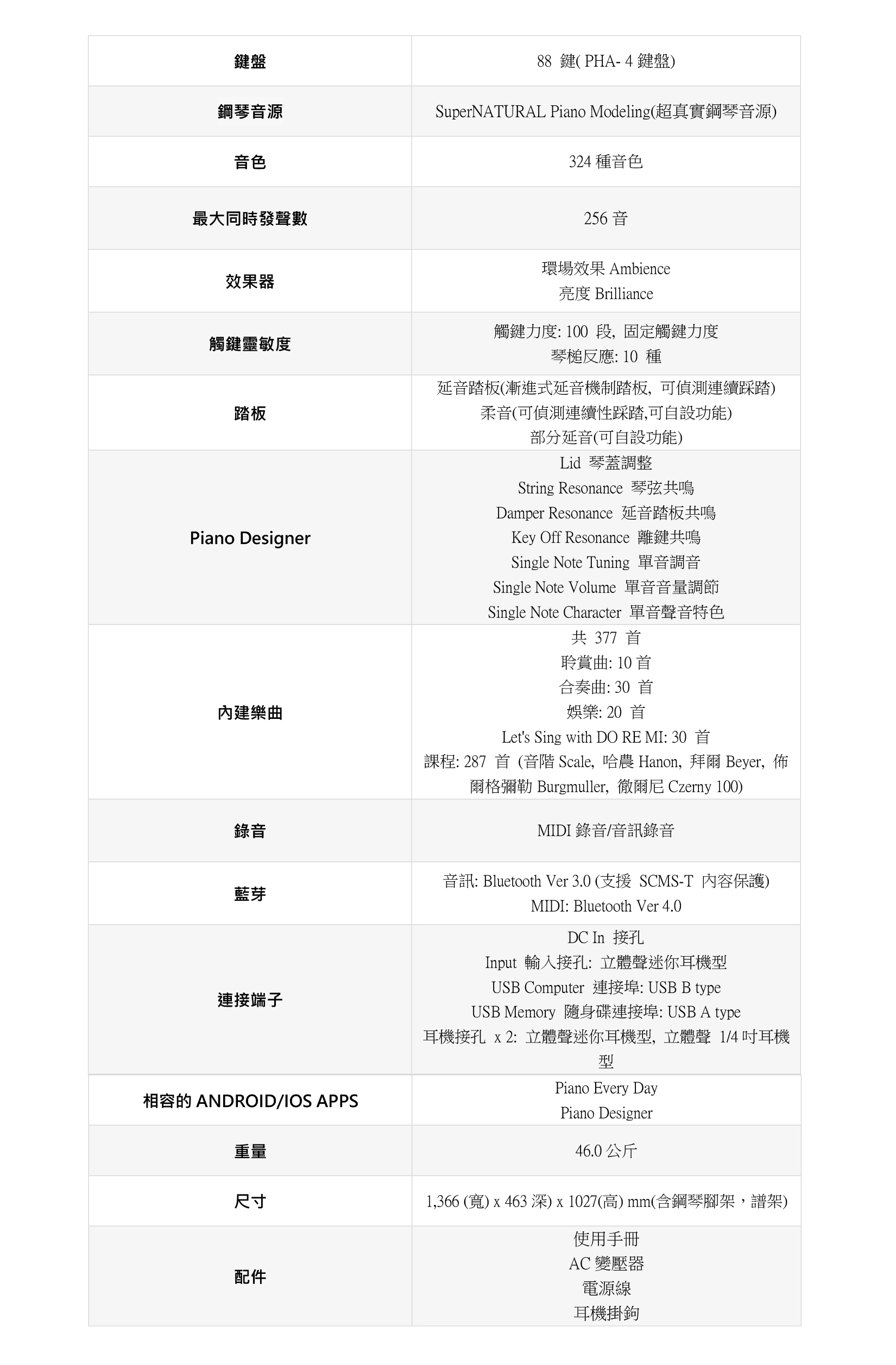 如果您正在找尋一部給全家人的鋼琴,Roland RP701 是完美的選擇。學習彈琴時,音質和鍵盤演奏感是最首要的兩個條件,這款價格實惠的數位樂器,提供了 Roland SuperNATURAL Piano 鋼琴技術明亮、飽滿的音質,加上我們優異演奏性的 PHA-4 標準鍵盤,打造出傳統鋼琴的真實感覺。RP701 的設計也非常直覺,即使年幼的小小鋼琴家也可以立即上手。簡單易讀的圖示和整潔的前方面板,可確保您能夠專注於演奏和享受上,而無須翻閱使用手冊。透過內建的藍牙連結功能,您可以從智慧型手機中播放線上音樂,並使用多種app,總是不斷出現一些新鮮程式可以嘗試,以保持每個人的學習動力。透過強大的內建揚聲器,讓樂聲洋溢房間,在沉浸式體驗的耳機 3D 音場效果當中,可以靜心磨練您的演奏技巧,或者單純地欣賞它高質感的傳統風鋼琴外觀,為您的居家生活帶來精緻的氣質。無論您要讓孩子學習,或是您自己想要重返鋼琴的懷抱,RP701 的聲音、演奏感,和外觀都能為全家人帶來愉悅。