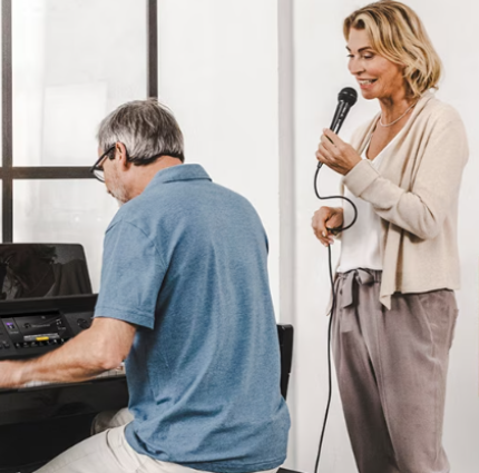 隨著 CLAVINOVA 唱歌只要連接麥克風即可享受自彈自唱的樂趣。提供自然和聲與合唱,可於智慧型裝置下載並安裝 Smart Pianist 應用程式顯示歌詞,而且歌詞會隨著演奏改變字體顏色,輕鬆知道何時開口唱歌。
