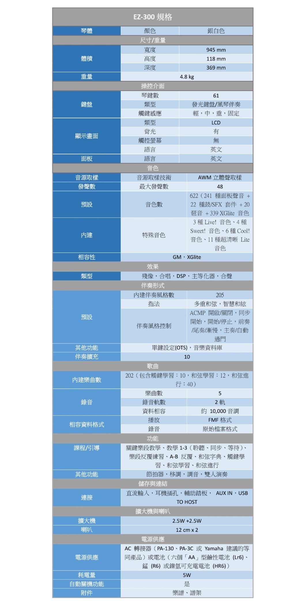 202 首內建樂曲,包括 10 首流行樂曲,以及擴充樂曲功能EZ-300 共有 202 首樂曲,分成 9 種不同風格:流行歌曲*、我的最愛、器樂名曲、經典鋼琴樂曲、學習彈奏、我的最愛(含伴奏)、日本歌曲、二重奏和鋼琴獨奏。此外 EZ-300 還特別收錄教學曲目,包括「觸鍵學習」,讓您可練習彈奏強度;「和弦學習」,讓您學習各式和弦;「和弦進行」,讓您學習不同的和弦進行。您還可以使用電腦,傳輸自己的 MIDI 樂曲,並使用「課程」和「燈號引導」功能隨樂曲彈奏。