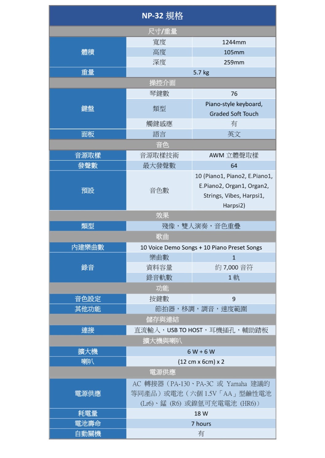 Piaggero讓您從第一個音符就為之驚艷,從Yamaha音樂會平台鋼琴到甜美電子琴聲,小巧琴身所裝載的高品質音色讓演奏變得有趣無比。NP-32的分級輕柔觸鍵(GST)則使低音更重高音更輕,讓音色自然又表現力十足