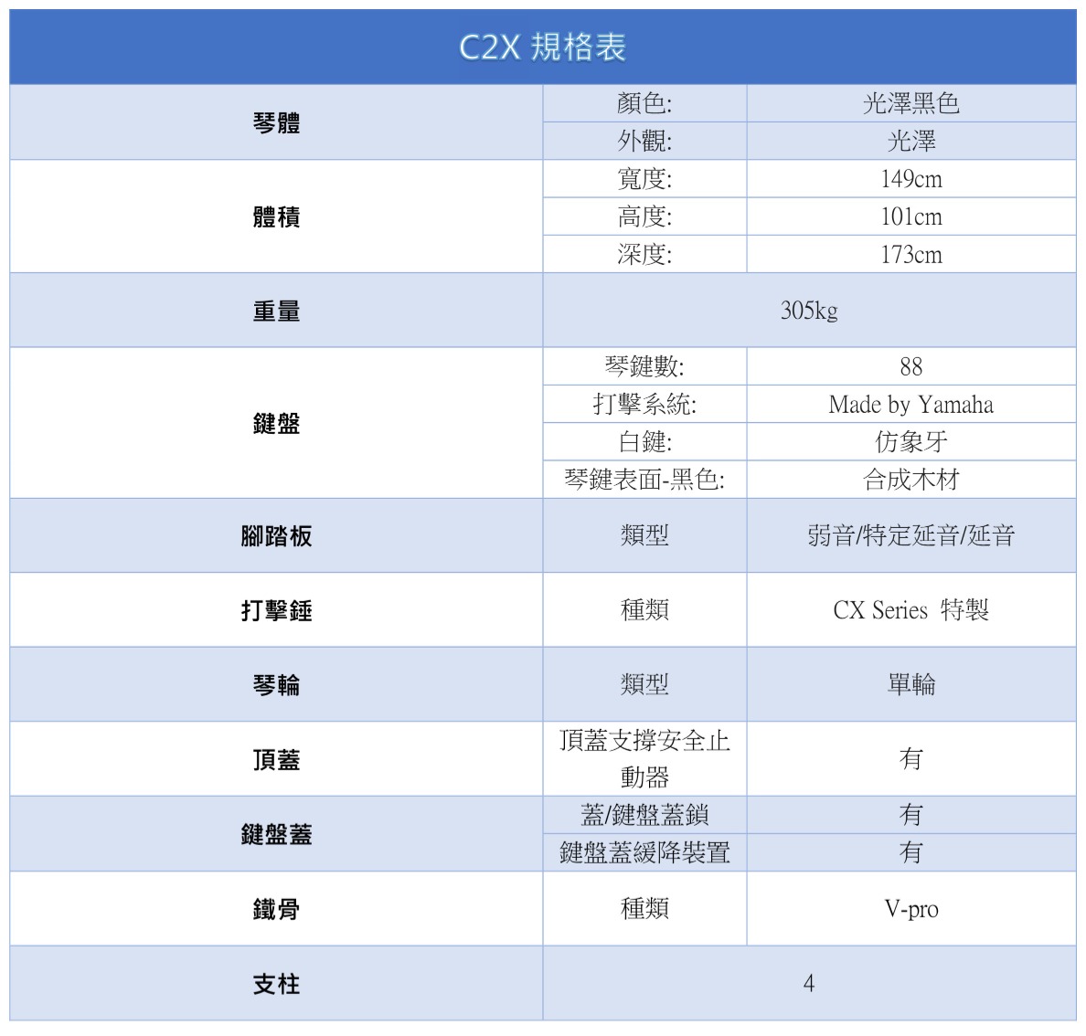 演奏型平台鋼琴CFX的成功對Yamaha而言乃為劃時代的製琴成就。除了充分發揮悠遠歷史所培育出的製琴工藝外,更為了堅持美麗的聲音,大膽地改變既往設計,無庸置疑CFX將在下一個世紀佔據重要的地位。 現今,Yamaha迎接125週年紀念的同時,創新的製琴工藝、知識、技術等已全數注入平台鋼琴CX系列,其透徹無瑕、絢爛豐富的音色、完美且細膩的和聲,在在展現我們大膽卻精密的革新。從現在起讓我們的家庭空間幻化為夢想中的音樂廳吧!