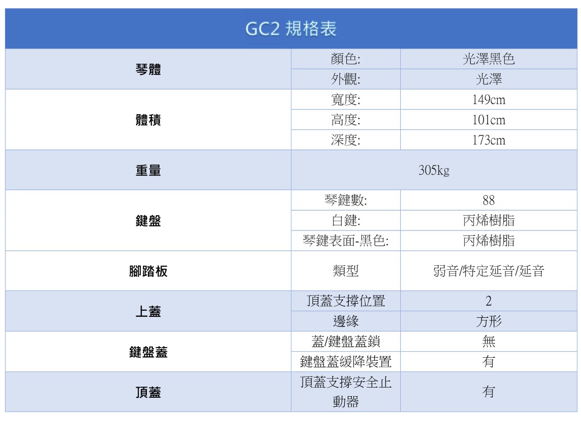 GC結合雙重共鳴音階設計 (duplex scaling) 與夢寐以求的C2平台鋼琴豐富音色,再加上材質與製造成本降低等優勢,打造出一款兼具卓越表現力且價格超實惠的產品。