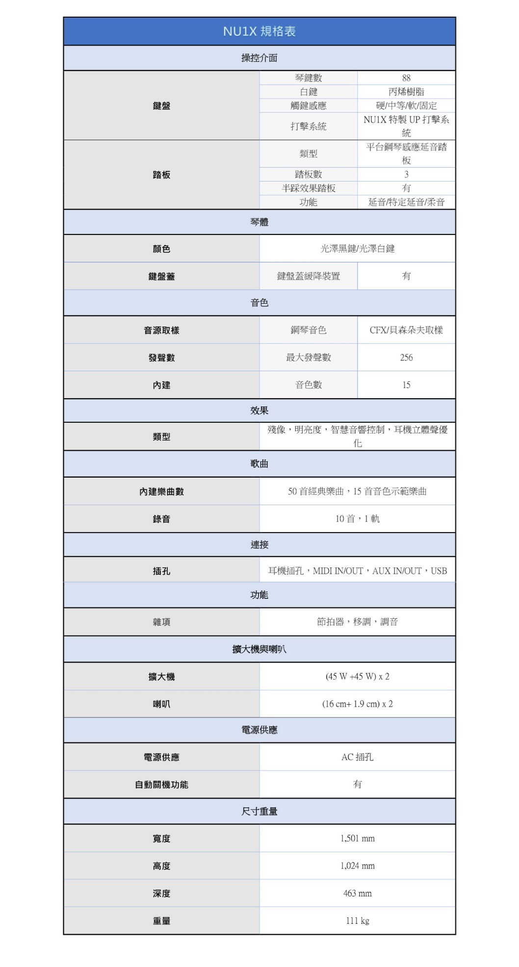NU1X代表數位鋼琴技術的下一個未來發展趨勢,融合Yamaha 無與倫比的鋼琴製作工藝和漸進的數位創新技術。NU1X 採用真實的直立鋼琴演奏動作,讓彈奏者和鋼琴融為一體,享有令人愉悅的動態體驗。呈現出的不僅是對原聲音色最崇高的敬意,同時超越所有的期待。