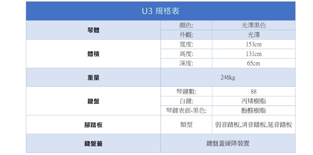 U 系列以其溫暖且紮實渾厚的音色和始終如一穩定的可演奏性吸引您的目光,第一次彈奏就讓您沉醉在鋼琴的琴音中。該型號完整體現 Yamaha 直立鋼琴,展現數十年來已然成熟的鋼琴標準,承繼基本規格和特性,並讓專業鋼琴家高度讚揚